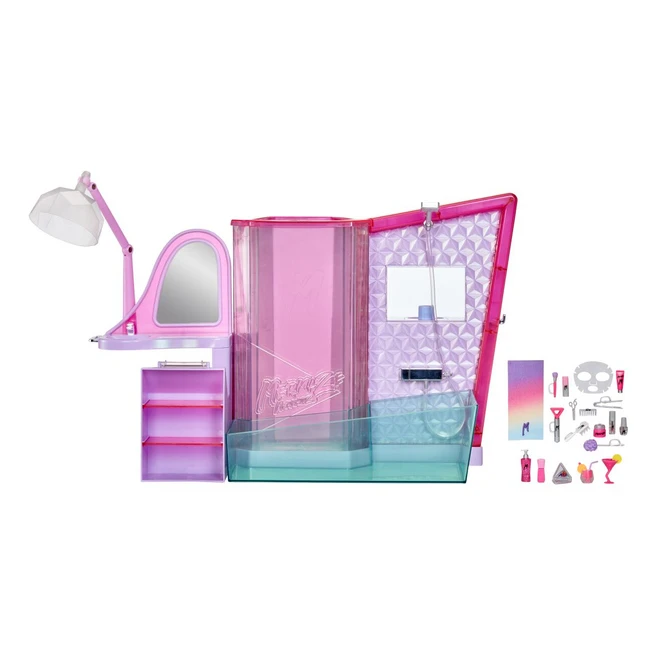 Wusstest du, dass Meerjungfrauen genauso sind wie wir? Sie lieben es, mit ihren Freunden im Salon rumzuhängen! Fülle den Raum mit Wasser und beobachte, wie das Wasser sprudelt und sich an der beleuchteten Wand nach oben bewegt, während sich deine Puppe darin entspannt und ihre Schwanzfarbe verändert! Oder benutze die funktionierende Badewanne für ein entspannendes Bad. Wenn sie fertig ist, setzt du sie in den Salonstuhl vor dem Frisiertisch, um ihr ein neues Make-up zu verpassen! Der Haartrockner wird zu einem Trichter, um die Sprudelwand mit Wasser zu füllen. Enthält jede Menge Accessoires für einen entspannenden Wellness-Tag.