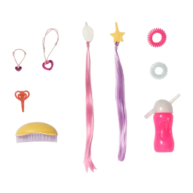 - Flasche, Haarbürste, 2 Spiralgummis, 2 Haarclips, 2 Clips mit Haarsträhnen